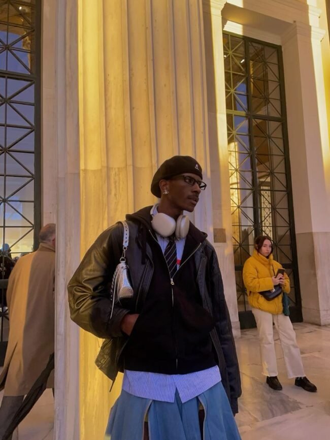 Accessories play a pivotal role in this outfit’s success. From the white beret to the layered gold necklaces, each piece contributes to the outfit’s vintage-meets-modern appeal. The beret adds a playful preppy touch, while the jewelry injects a dose of streetwear luxury. Together, they create a refined yet approachable vibe.